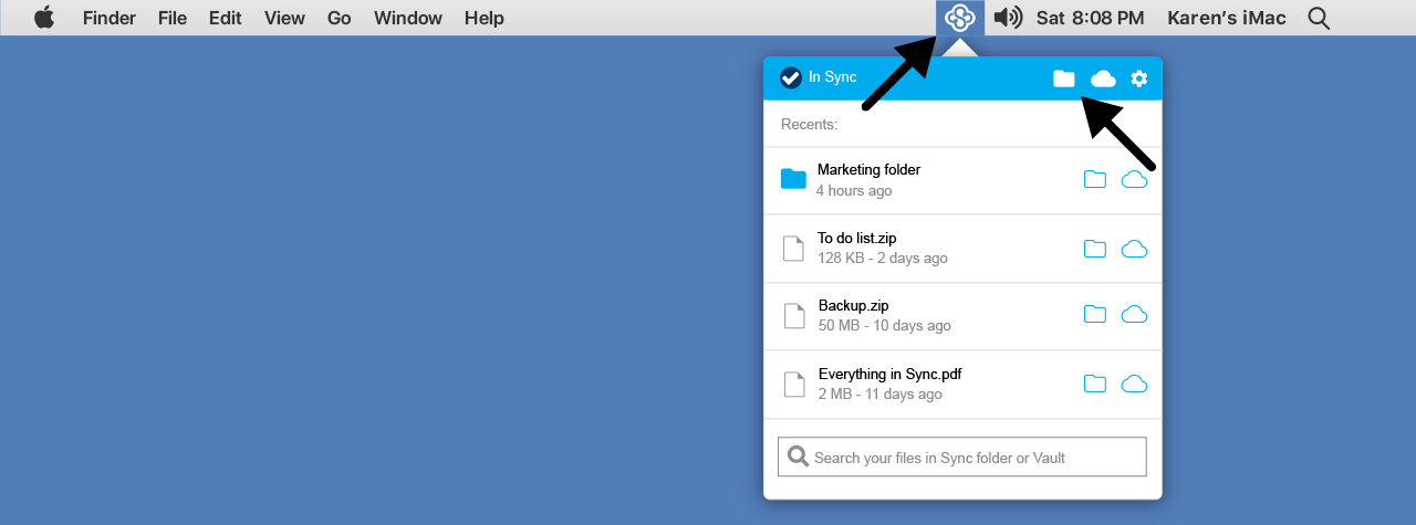 You can use the Sync desktop app or mobile app to search for any file located in your Sync folder or Vault, and to quickly access recently added or changed files.
