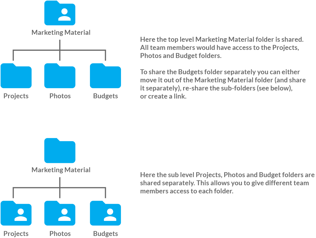 With team shared folders you can only share a top-level folder or its sub-folders, but not both. As such, a flat folder structure is recommended to ensure that access is clearly defined and easily understood by all users.