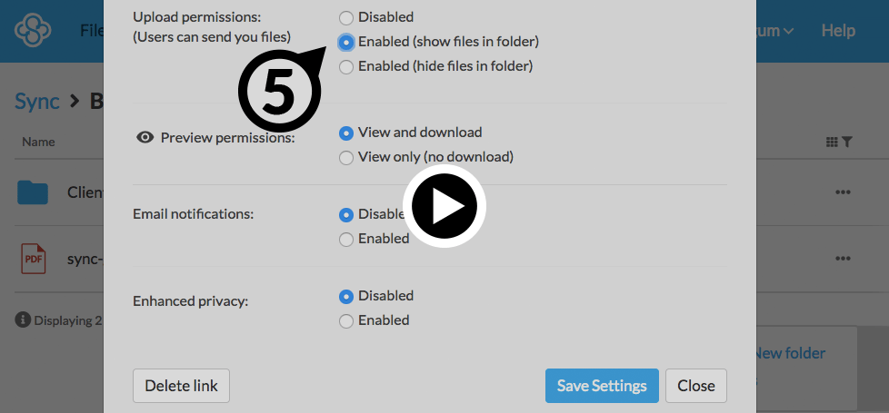Basic permissions include custom passwords and removing links (to revoke access). Sync Pro and Business customers can set advanced permissions, such as expiry dates and activity notifications.